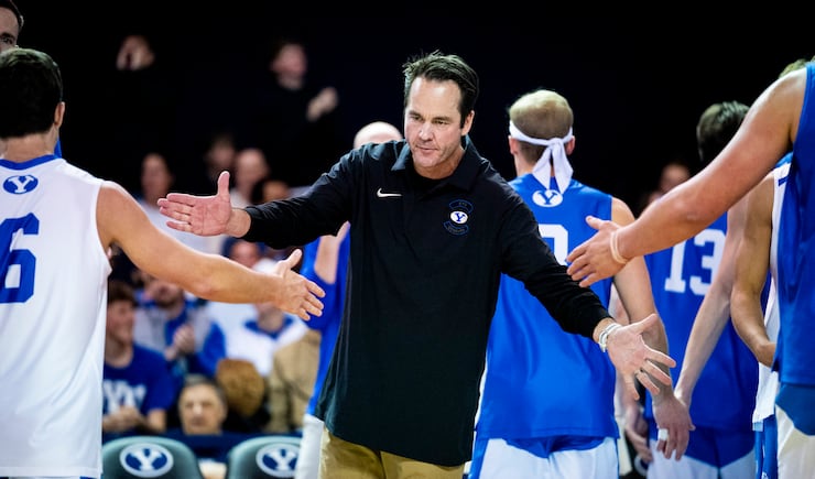 BYU head coach Shawn Olmstead slaps hands with his players as a timeout is taken during an NCAA men’s volleyball game against UC San Diego held at the George Albert Smith Fieldhouse in Provo on Friday, Jan. 16, 2026. | Isaac Hale, Deseret News