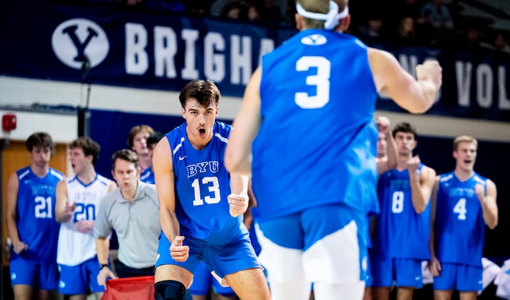 BYU outside hitter Trent Moser (13) celebrates a point against UC San Diego during an NCAA men’s volleyball game held at the George Albert Smith Fieldhouse in Provo on Friday, Jan. 16, 2026. | Isaac Hale, Deseret News