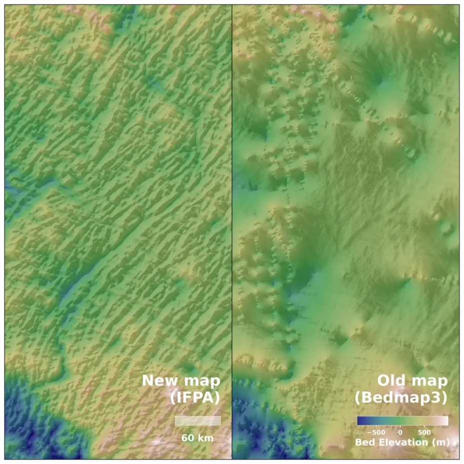 The map was published in the paper Complex mesoscale landscapes beneath Antarctica mapped from space, by Helen Ockenden and others, in the journal Science.