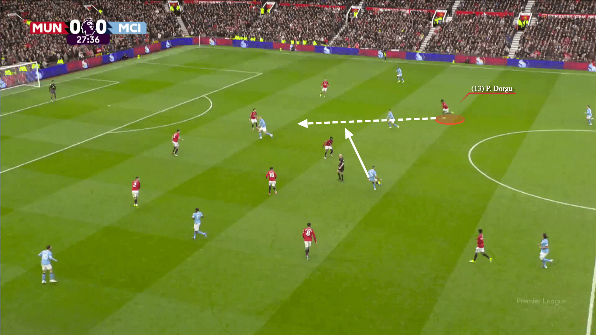 Rather than asking them to execute these risky forward jumps into midfield, United looked to plug gaps against City on Saturday through recovery runs from ahead of the ball. In the example below, Rodri picks out Phil Foden between the lines, but Patrick Dorgu is alert and sprints back from left midfield to close the space and win back possession.