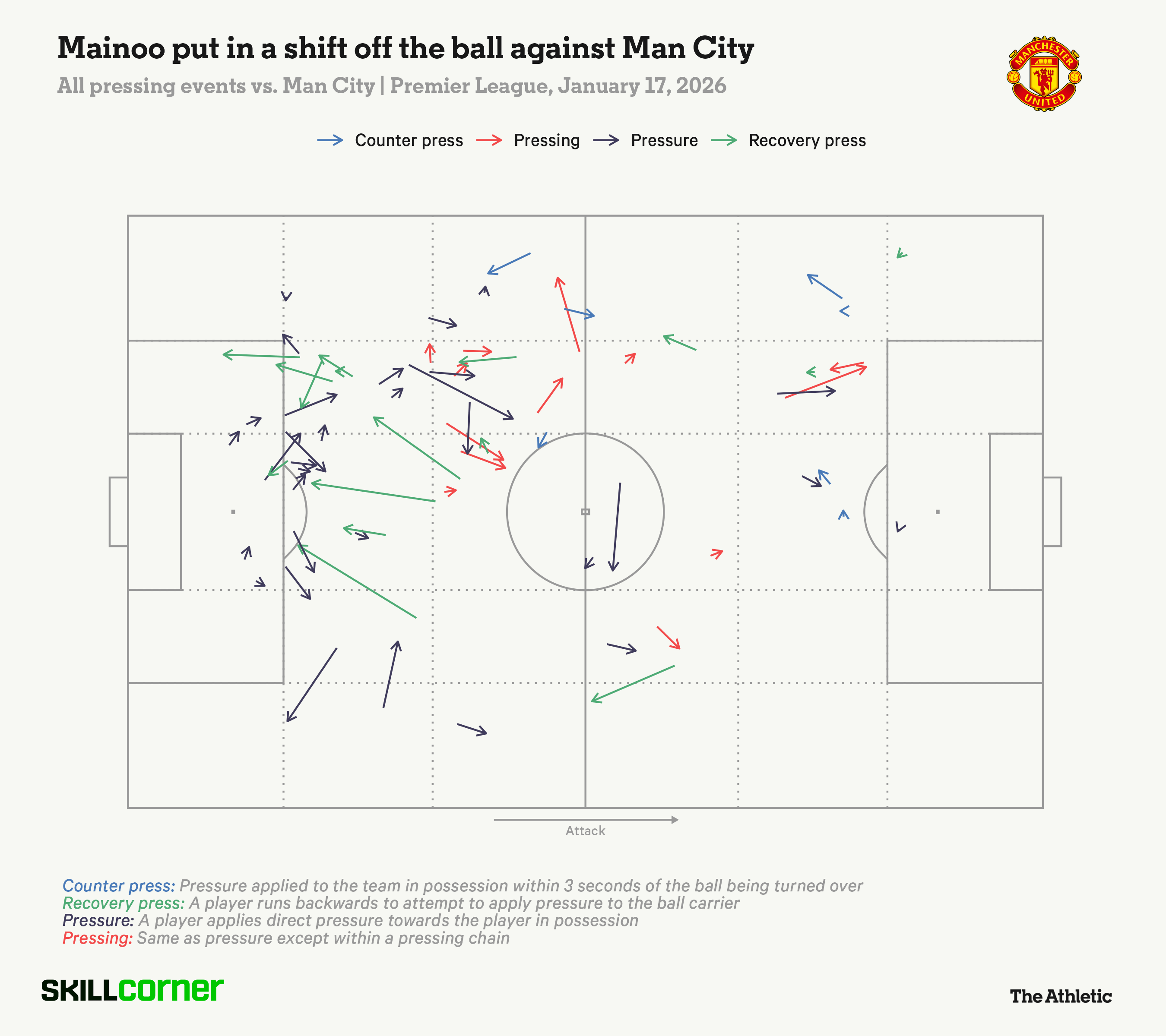 That dynamic of Mainoo pushing forward and Casemiro shifting across to screen the space behind allowed United to nullify Rodri’s influence without compromising their defensive solidity. Mainoo — frequently criticised by Amorim for his off-ball work — covered ground relentlessly, as shown by the map below of his pressing actions.