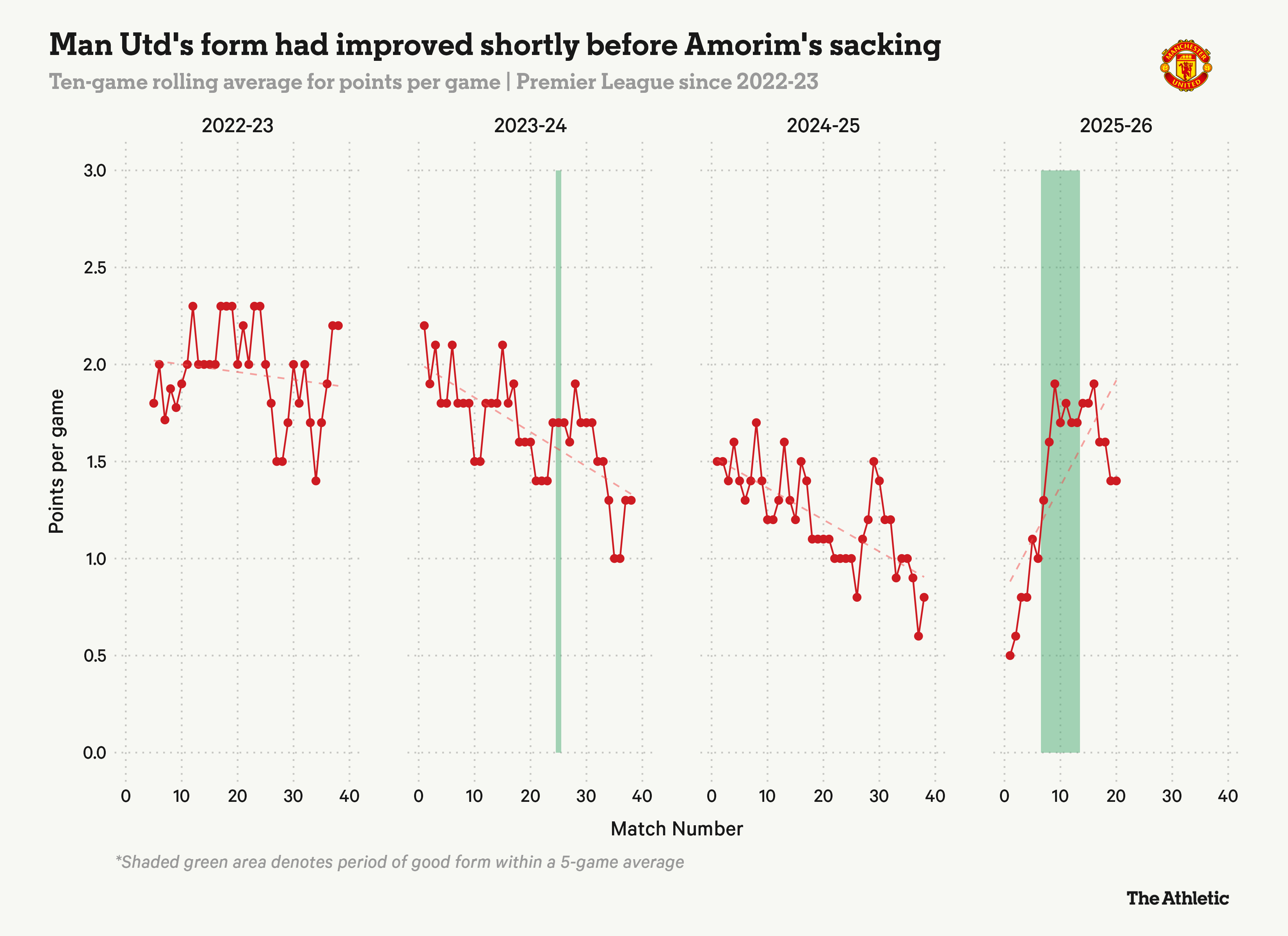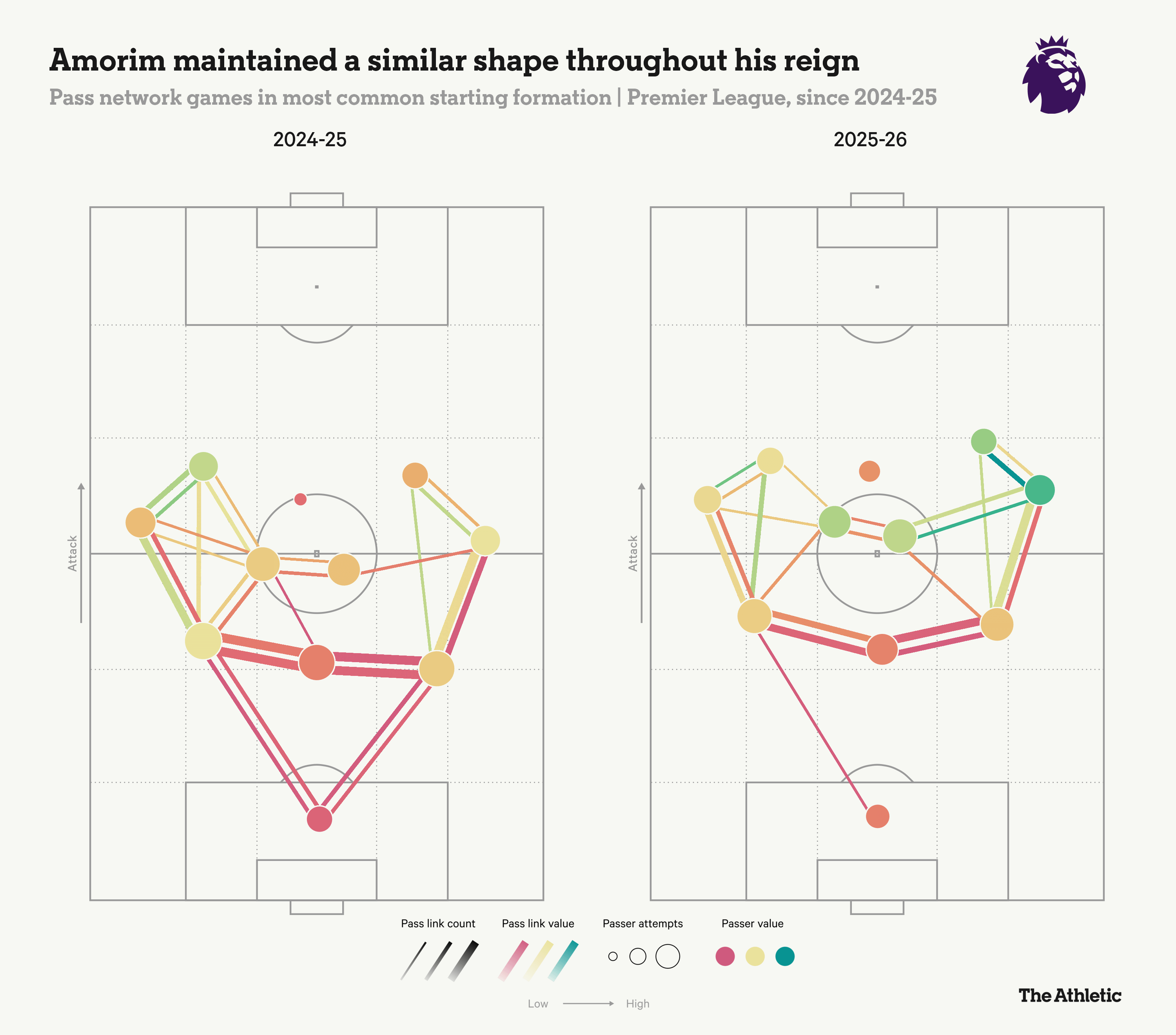 Here, The Athletic breaks down Amorim’s tactical approach — what it was trying to achieve, where it fell short — and how Carrick has already begun to address some of those shortcomings.