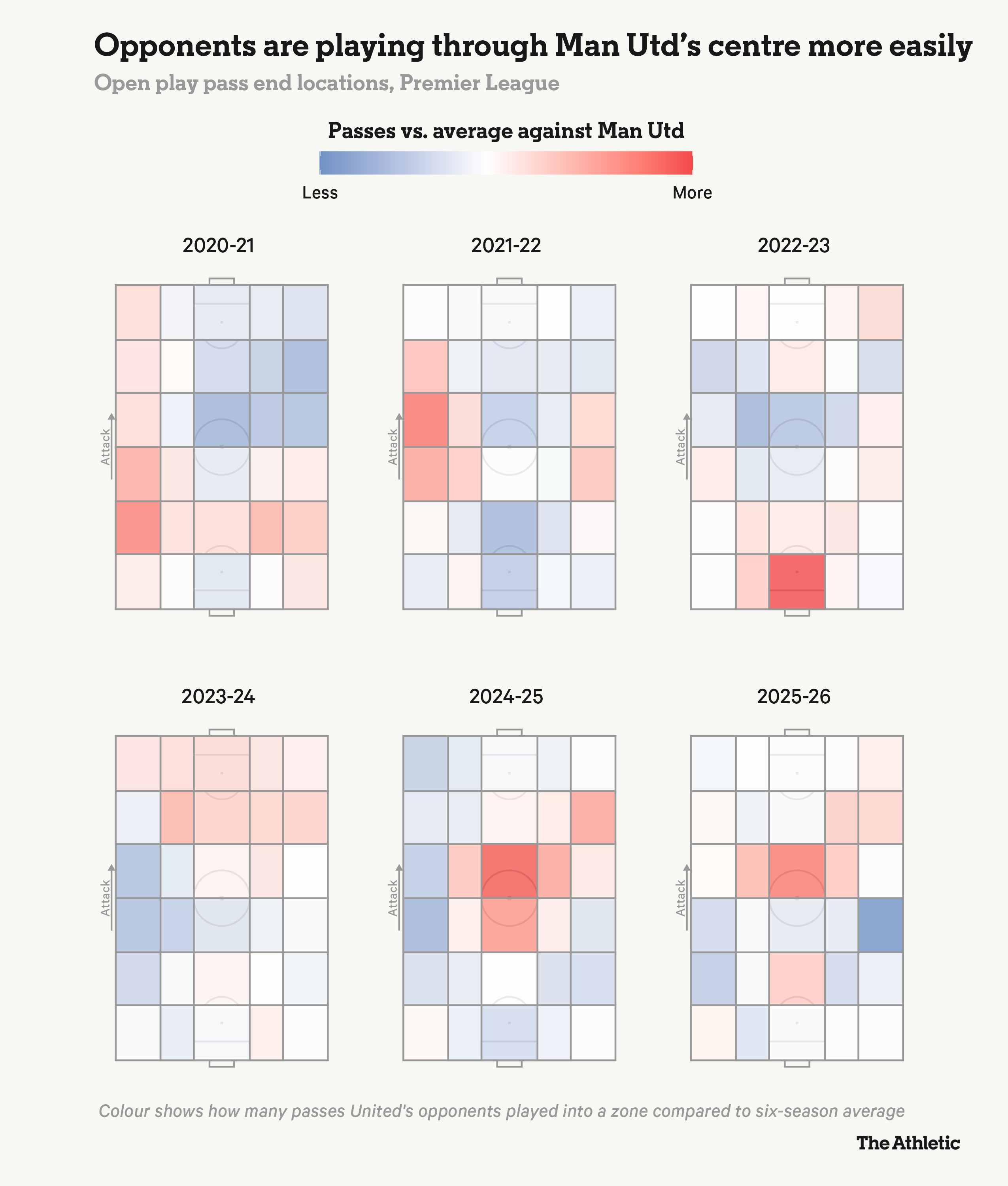The pitch map below shows the percentage of passes played into different zones against United, compared with their six-season Premier League average, highlighting a soft central area.