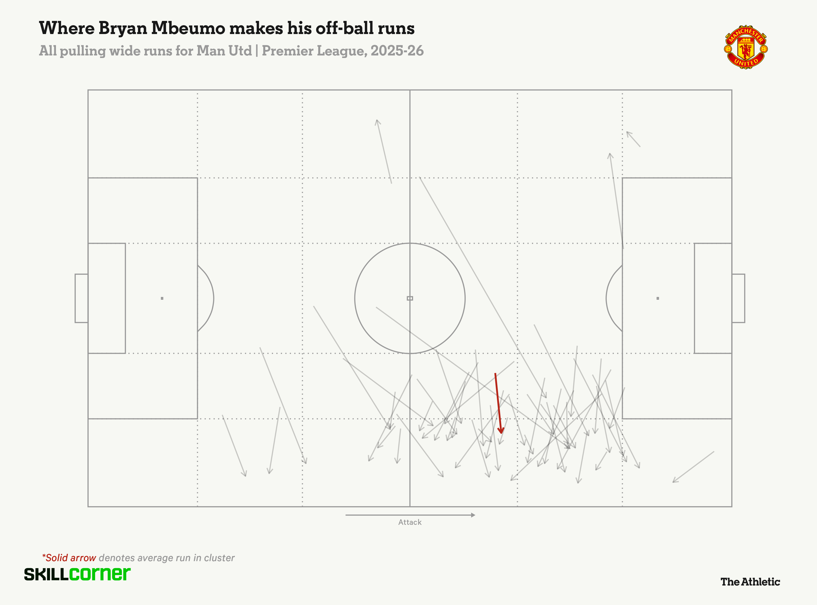 SkillCorner defines a pulling-wide run as a movement that starts in the centre or half-space and ends in the wide channel, finishing wider than the player in possession. By that measure, Mbeumo leads United this season with 53 such runs, with Amad close behind on 44.