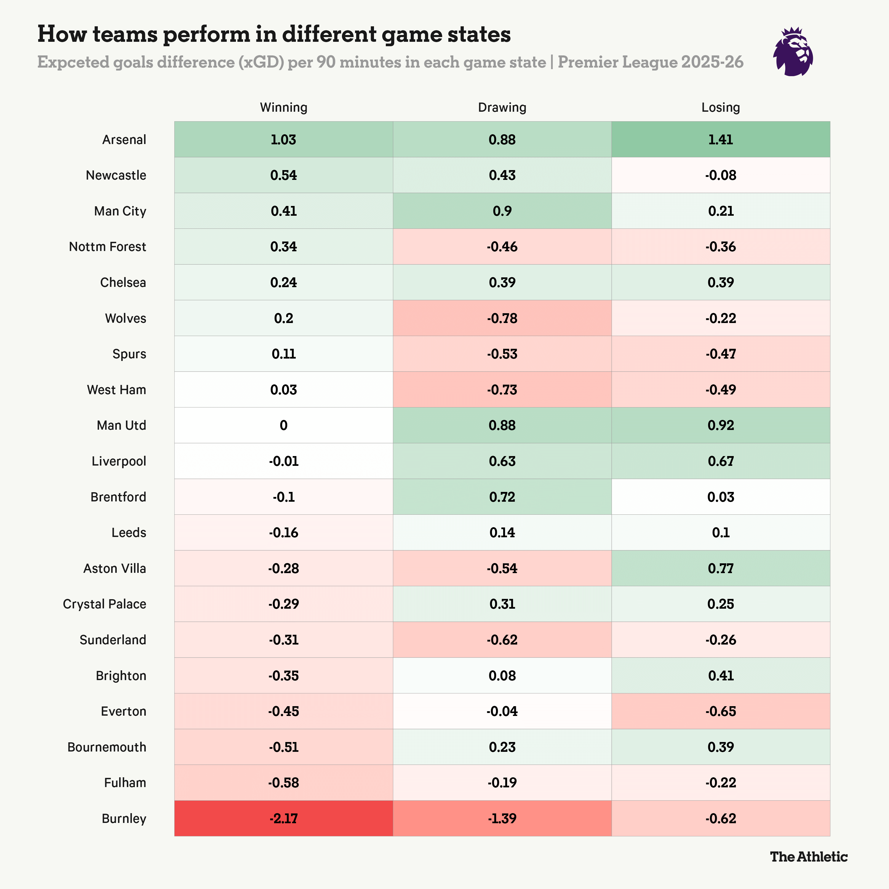 United also displayed a quality largely absent under Amorim: composure when ahead. As the graph below shows, United rank second in the Premier League for expected goal difference when trailing, and joint-second best when level, but struggle when in the lead.