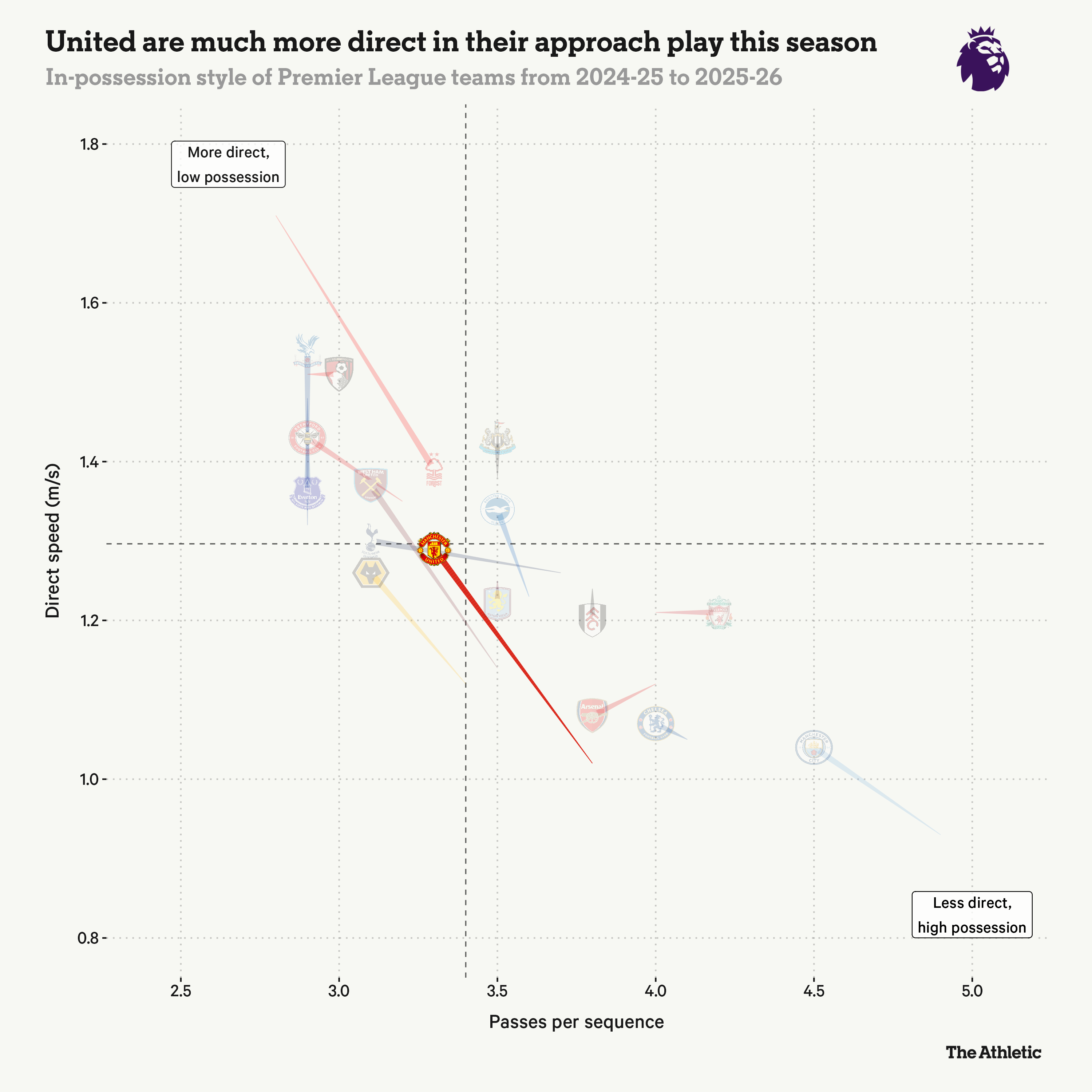 United’s ‘direct speed’ — a measure of how quickly the ball travels upfield — rose from 1.02 metres per second last season to 1.29m/s, the largest increase among clubs competing in the Premier League across both campaigns. At the same time, their passes per sequence fell from 3.8 to 3.3.