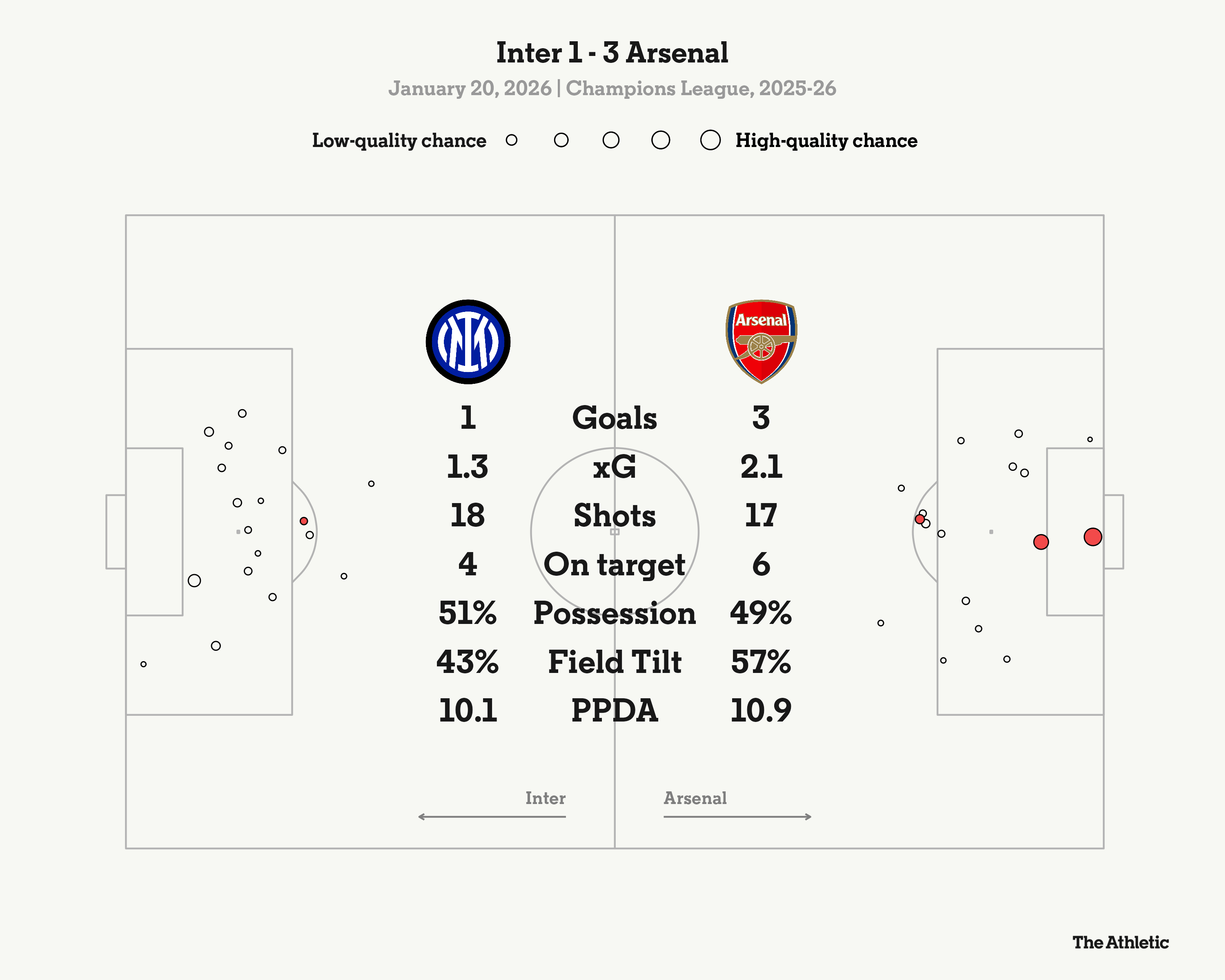 It created problems for Arsenal, who made some uncharacteristic errors in possession. They were dispossessed eight times in those opening 45 minutes — as many as in the entire game against Bayern Munich in this competition in November and one more than in the October defeat of Atletico Madrid.
