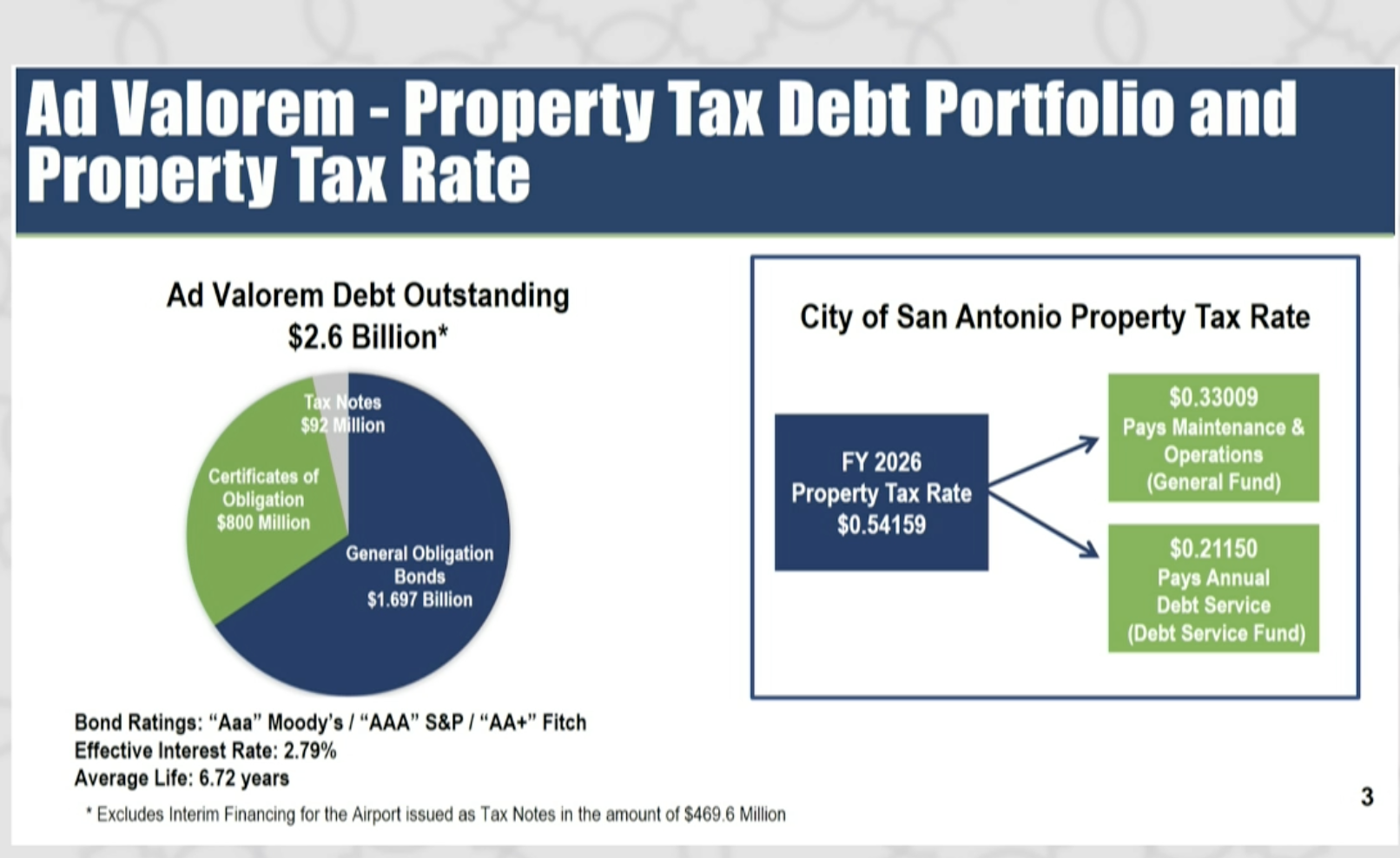 San Antonio funds most of its infrastructure projects through money that’s borrowed against the city’s future growth and repaid through the debt service portion of the property tax rate.