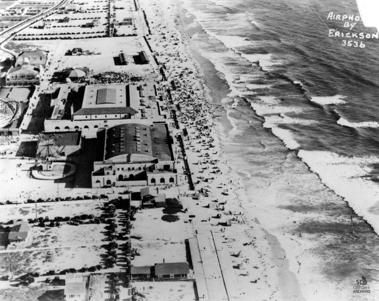 Aerial view of Belmont Park in 1927, a historic oceanfront amusement park located on Mission Beach. It was developed by sugar magnate John D. Spreckels and opened on July 4, 1925, as the Mission Beach Amusement Center. The attractions that remain from the original 1925 park include the Giant Dipper, a wooden roller coaster that is listed on the National Register of Historic Places. Another historic facility is The Plunge, an indoor swimming pool. (Photo by Erickson/courtesy of the city of San Diego Digital Archives)