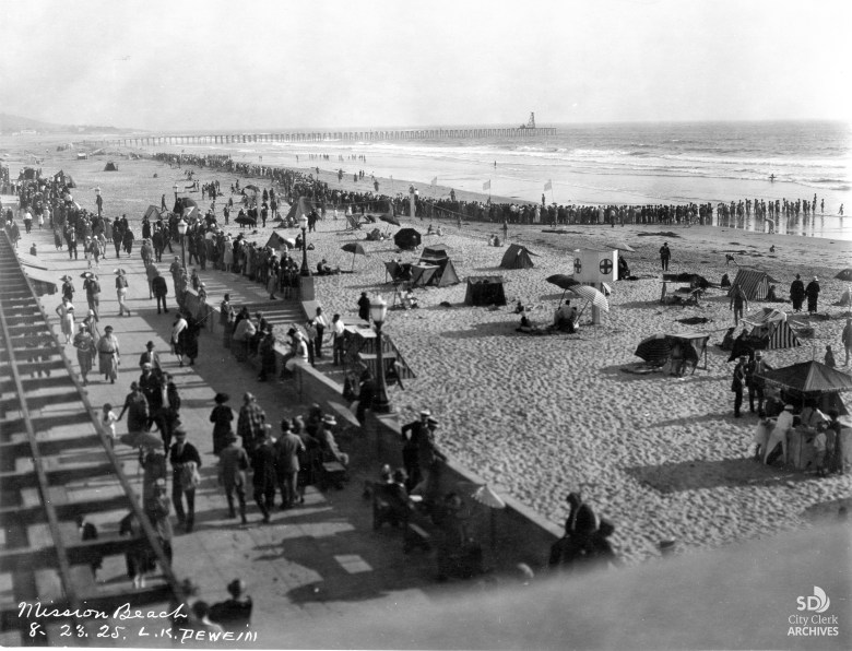 1925 photo of an event along the Mission Beach – Pacific Beach Boardwalk, also known as Oceanfront Boardwalk. It is a concrete walkway that spans about 3 1/2 miles, from North Pacific Beach to South Mission Beach. (Photo by L.K. Dewein/courtesy of the city of San Diego Digital Archives)