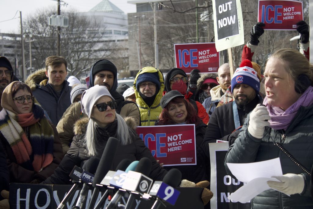 A crowd of hospital workers holds signs calling for the abolition of ICE on Jan. 27, 2026, after the killing of Alex Pretti. Credit: Mack Liederman/Block Club Chicago