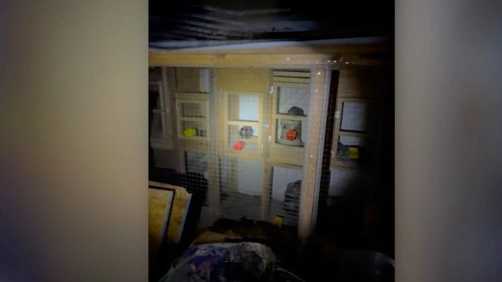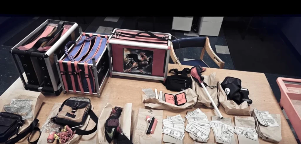 Police video shows a suitcase with the label of a Miami-based supplier of bird antibiotics, vitamins and other items. Dozens of cages are stacked two high, most with roosters inside, some appearing lethargic or dead.