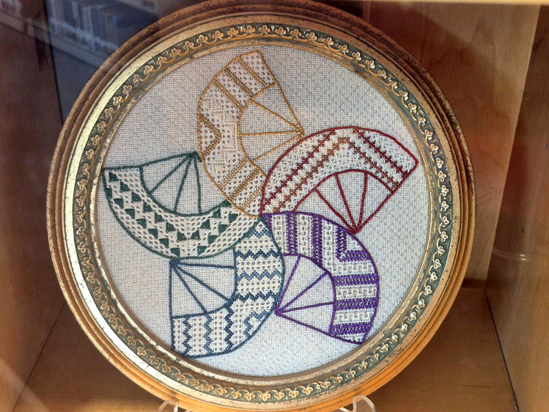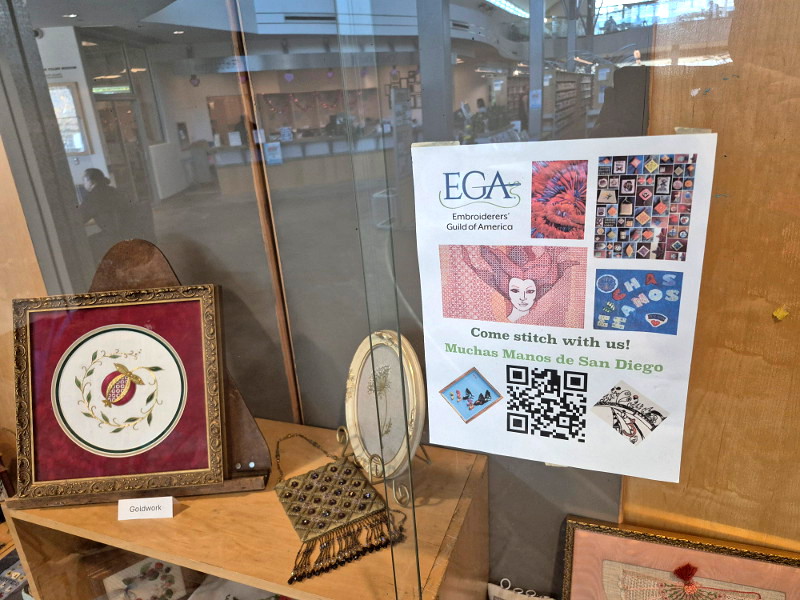 Muchas Manos de San Diego, a group of hand embroidery enthusiasts, is celebrating their 50th Anniversary with an exhibit inside the Mission Valley Library. The library’s large display case is filled with carefully stitched examples of very beautiful embroidery!