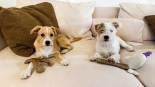 Leo and Remy, two Puppy Bowl pup-letes, are seen taking a little well-deserved downtime. (photo: Helen Woodward Animal Center)