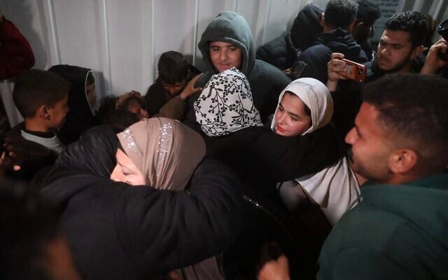Returnees to Gaza are welcomed by relatives after they arrive at Nasser Hospital following the long-awaited reopening of the Rafah Crossing, in Khan Younis, February 4, 2026. (AP Photo/Jehad Alshrafi)