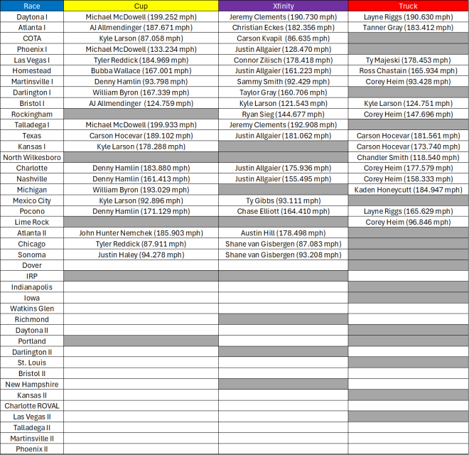 Below is a chart of the drivers that earned the bonus point (as well as the speed they ran) in every Cup, Xfinity and Craftsman Truck Series race run this year. The chart will be updated weekly.